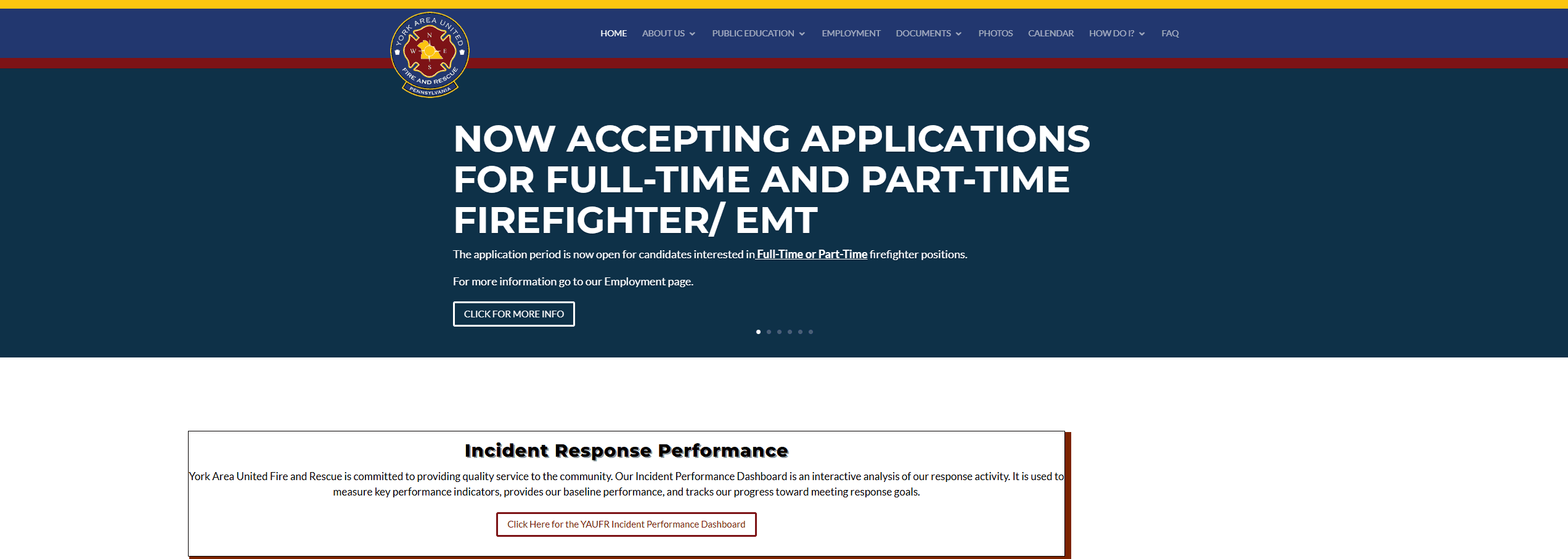 York Area United Fire and Rescue is committed to providing quality service to the community. Our Incident Performance Dashboard is an interactive analysis of our response activity. It is used to measure key performance indicators, provides our baseline performance, and tracks our progress toward meeting response goals.